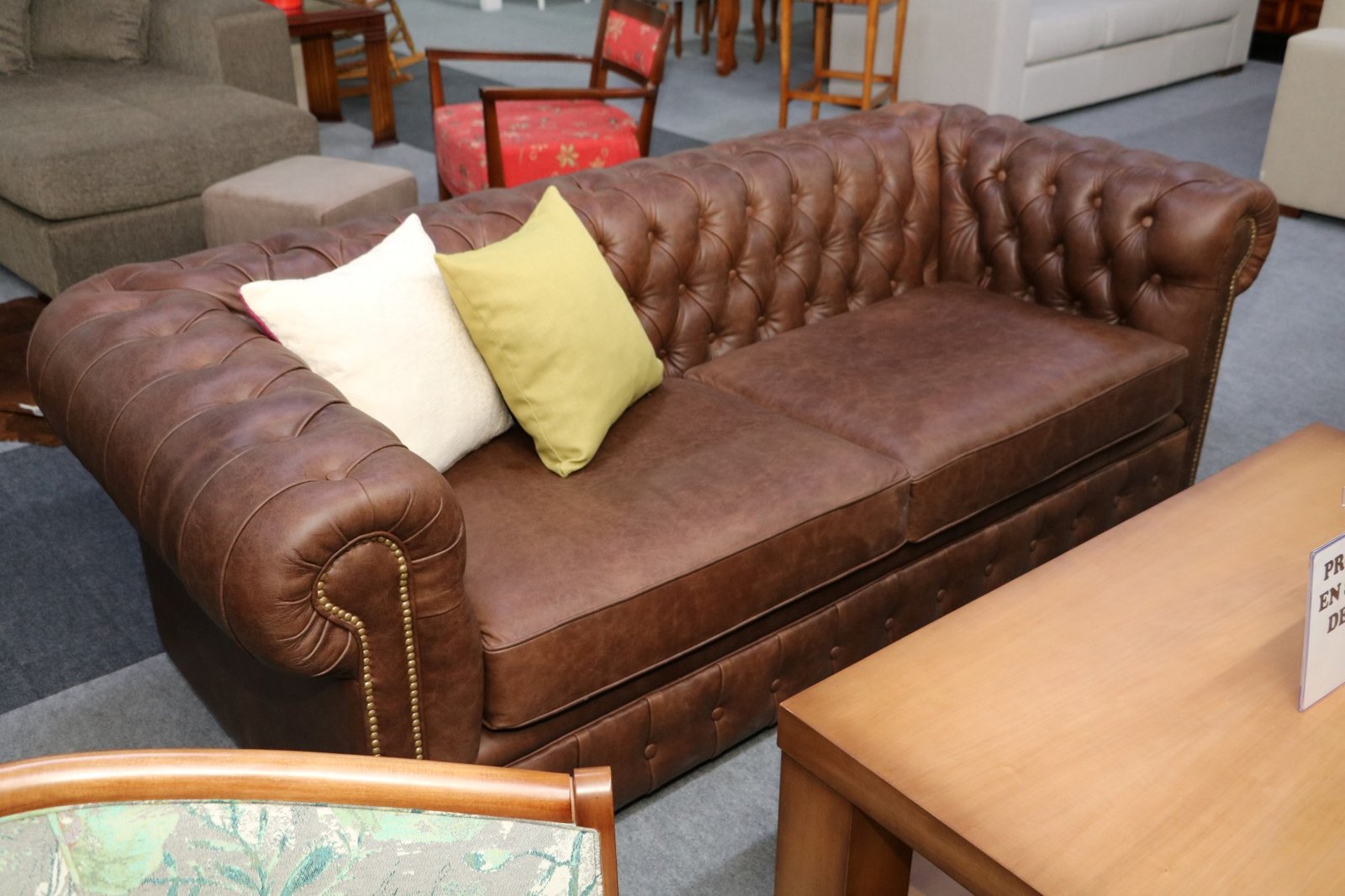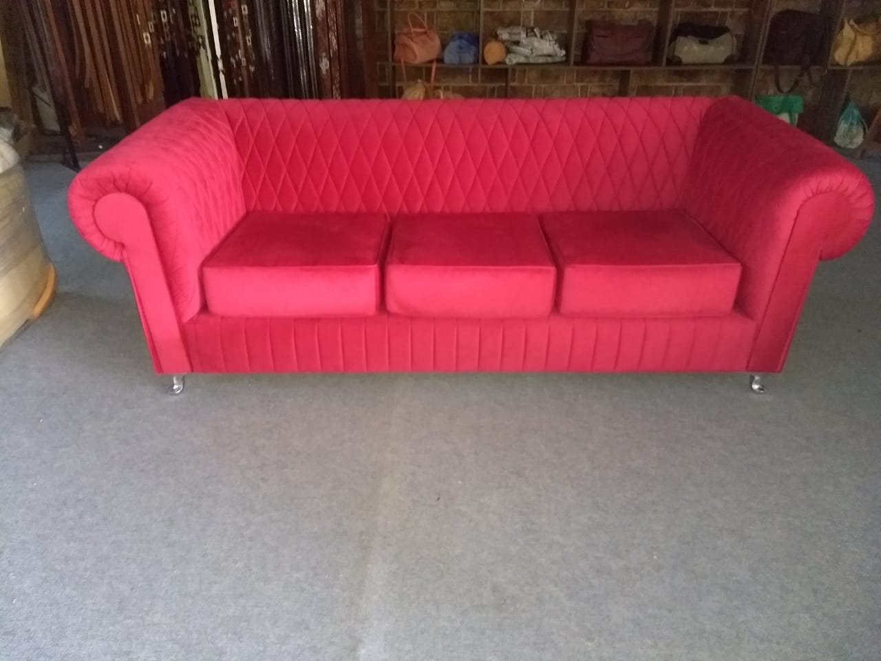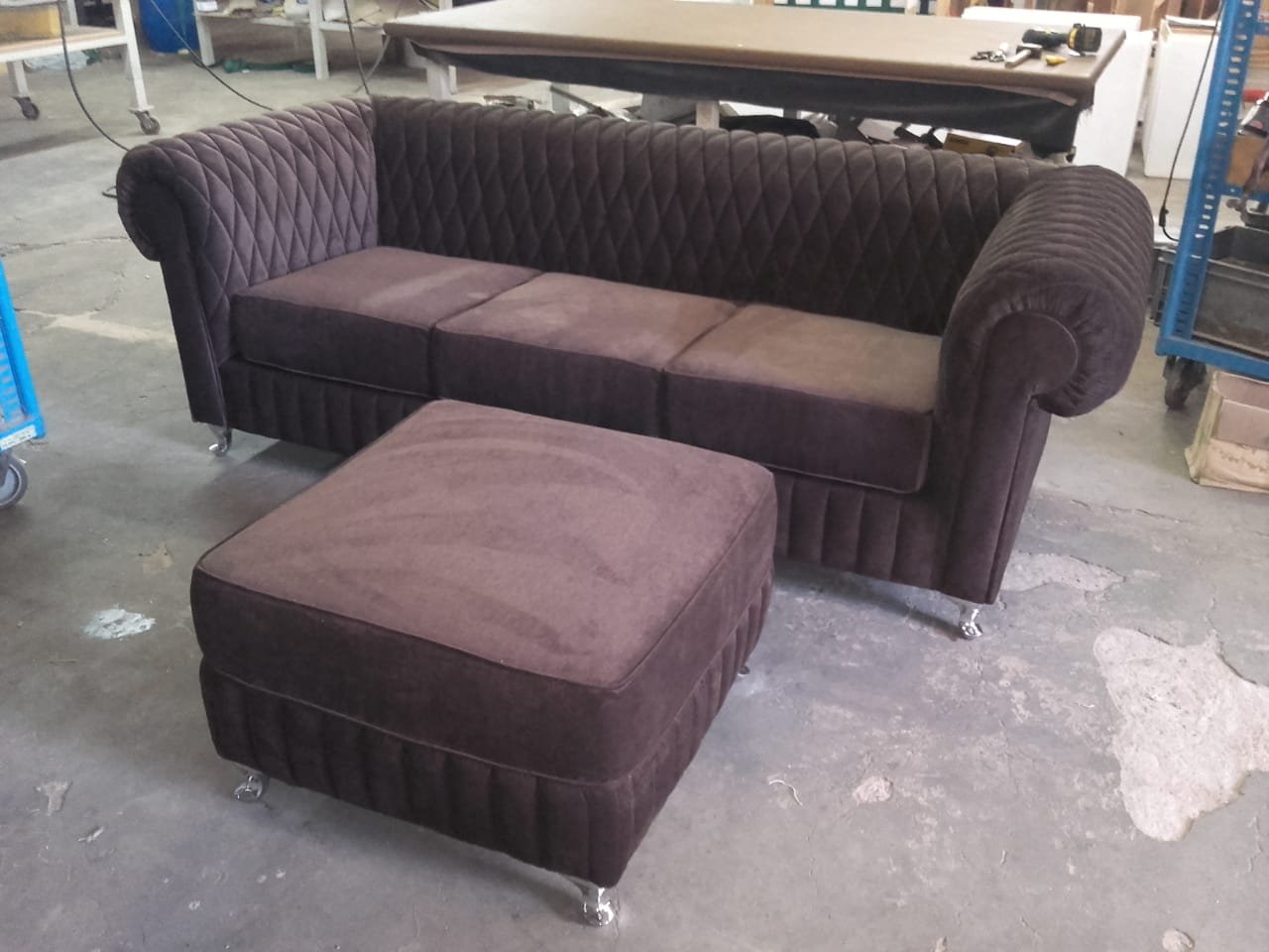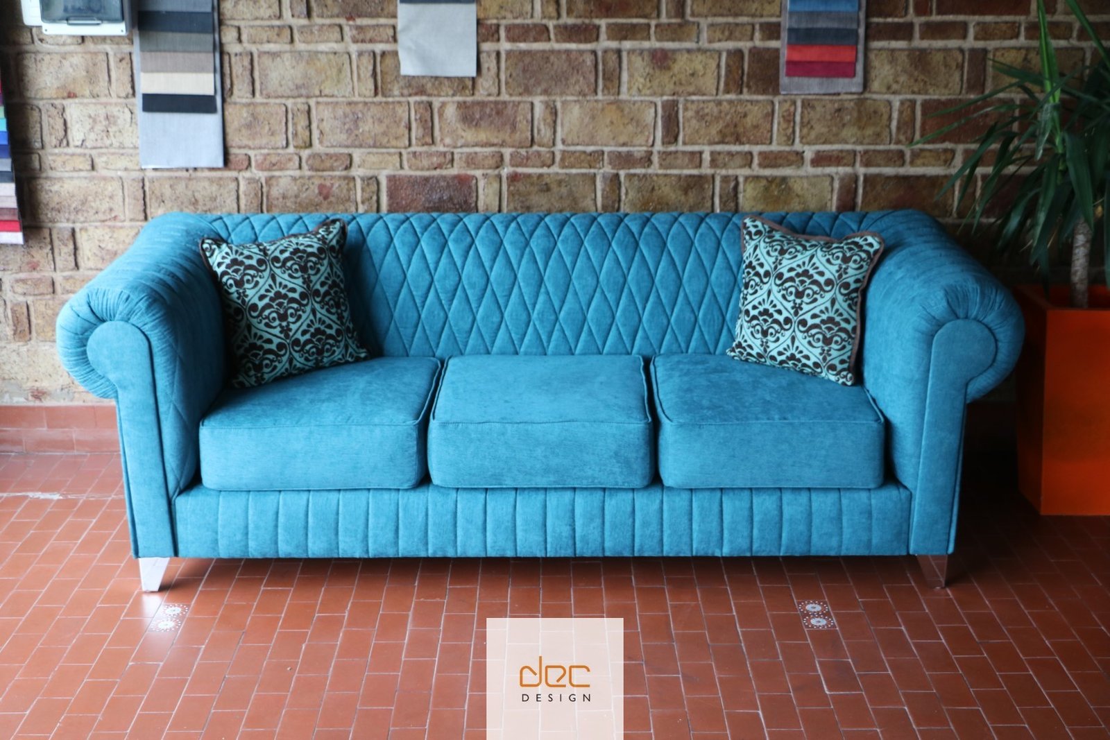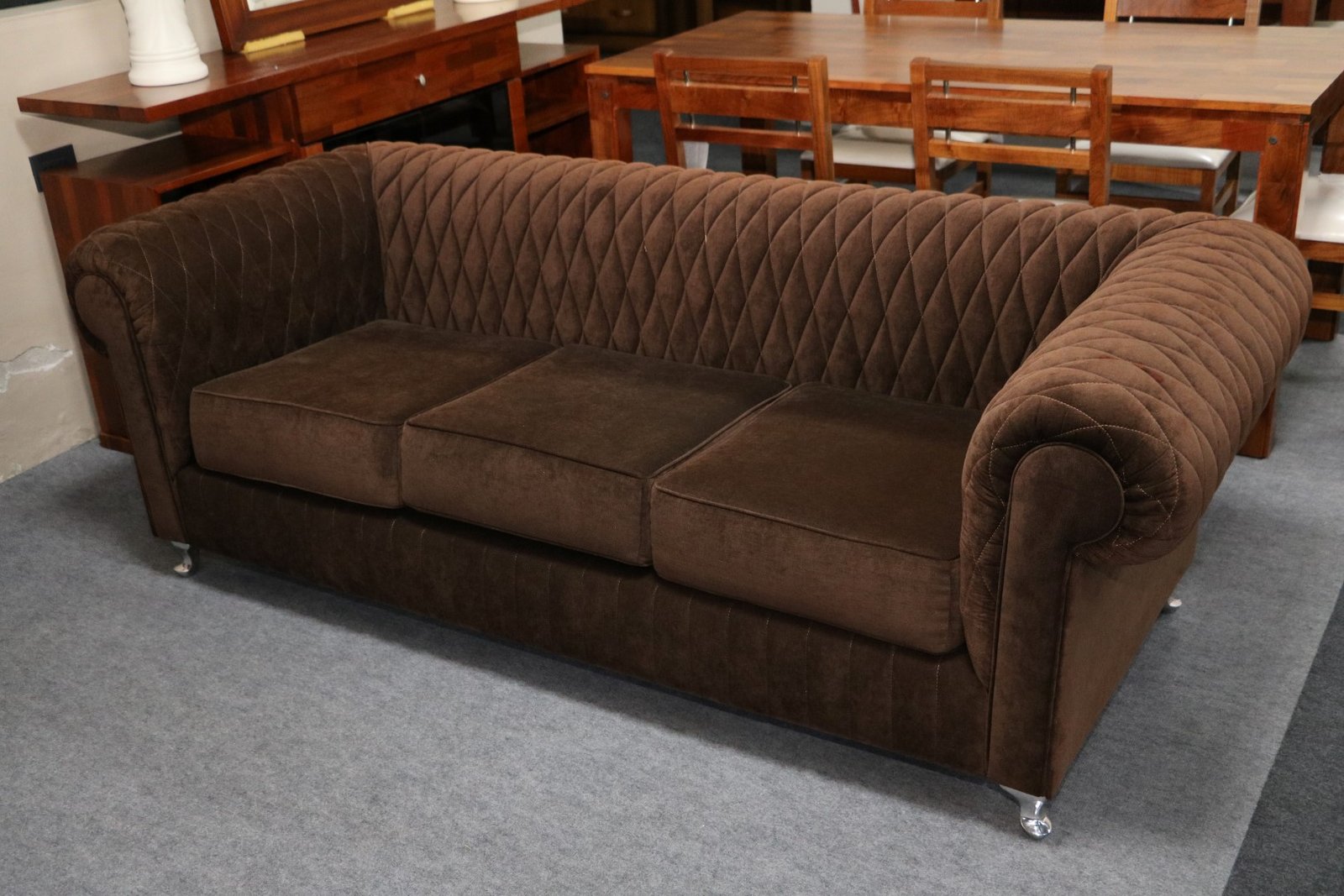Sofá de estilo clásico, con tela de alta calidad y matelasseado geométrico, adaptable a gran variedad de ambientes por su corte elegante y tradicional.
